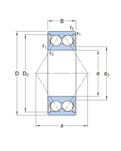 Double row angular contact ball bearings, with seals or shields, correspond to a pair of single row angular contact ball bearings in a back-to-back arrangement, while requiring less axial space. Depending on the sealing execution, they can operate at high speeds and are more suitable than deep groove ball bearings for supporting large axial forces in both directions.