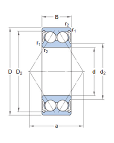 Double row angular contact ball bearings, with seals or shields, correspond to a pair of single row angular contact ball bearings in a back-to-back arrangement, while requiring less axial space. Depending on the sealing execution, they can operate at high speeds and are more suitable than deep groove ball bearings for supporting large axial forces in both directions.